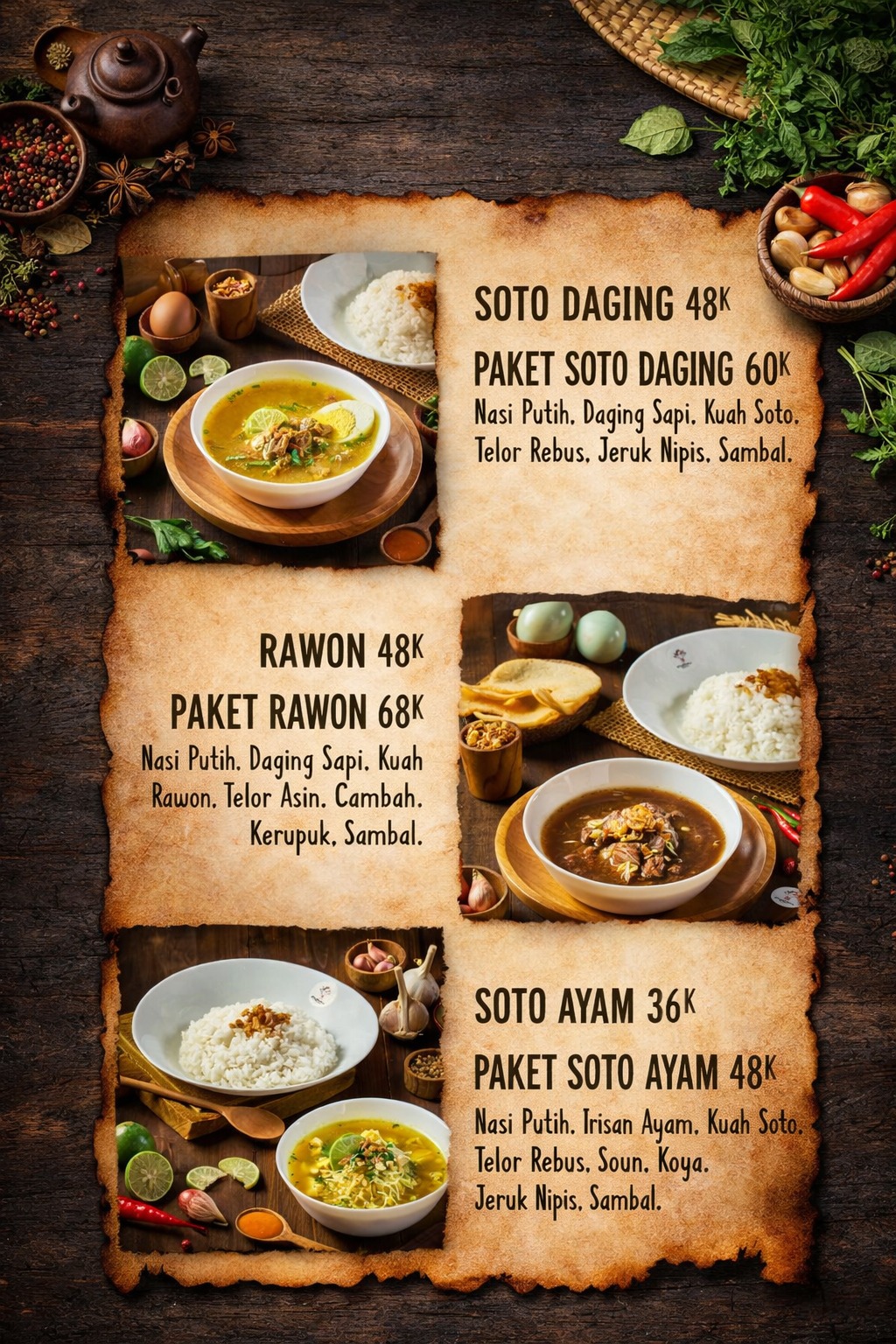 Kuah kuning bening yang harum rempah khas Jawa Timur, berisi irisan ayam kampung asli yang lembut. Dilengkapi koya gurih khas Jawa Timur, taoge, seledri, dan bawang goreng renyah, menciptakan harmoni rasa gurih, segar, dan hangat. Setiap suapan menghadirkan keaslian soto ayam Jawa Timur yang sederhana, otentik, namun selalu istimewa.