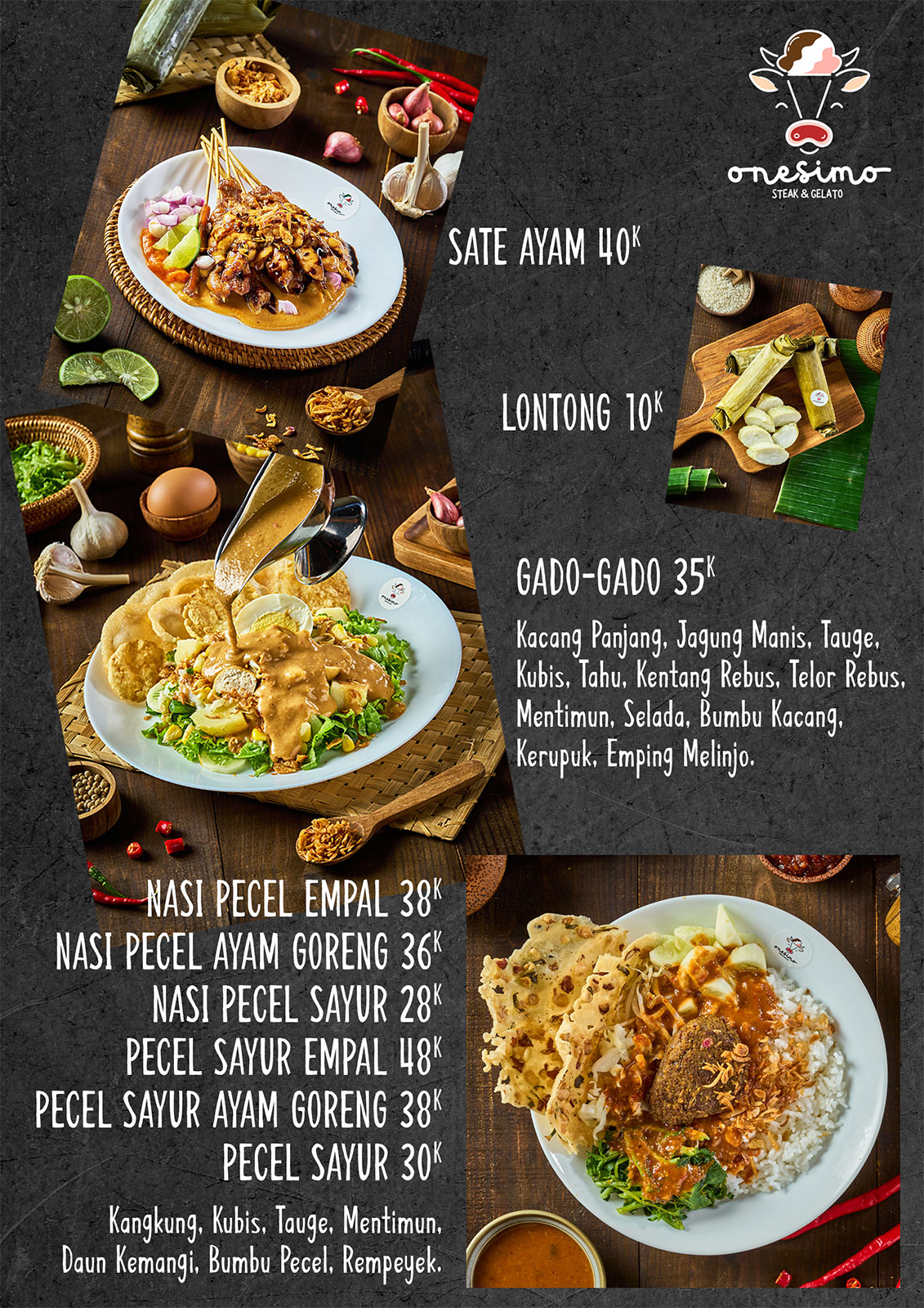 Perpaduan sayuran segar dan rebusan pilihan: kacang panjang, jagung manis, tauge, kubis, selada, tahu, kentang rebus, telur rebus, mentimun, dan lontong, semuanya disiram dengan bumbu kacang istimewa yang gurih, manis, dan legit. Hidangan ini semakin lengkap dengan kerupuk renyah dan emping gurih yang khas. Gado-gado ala Nusantara yang kaya rasa, sehat, dan mengenyangkan.
